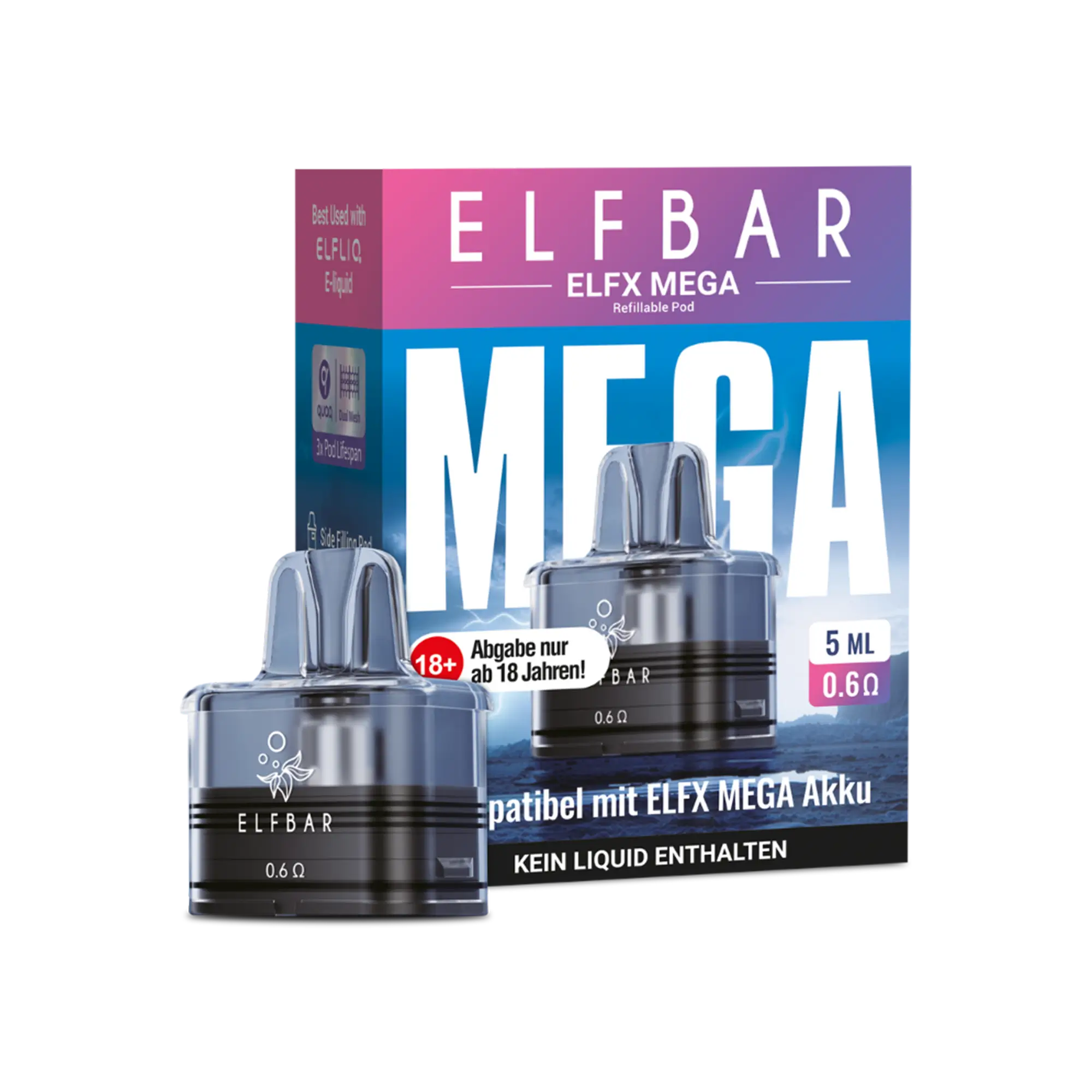 Die Elfbar ELFX Mega Leer-Pods wurden speziell für das ELFX Mega Pod-System entwickelt und bieten wahlweise ein Tankvolumen von 5 ml oder 10 ml. Das transparente PCTG-Tanksegment ermöglicht jederzeit einen freien Blick auf den Liquidstand, während das praktische Side-Fill-System mit Silikonverschluss ein schnelles und sauberes Befüllen gewährleistet.